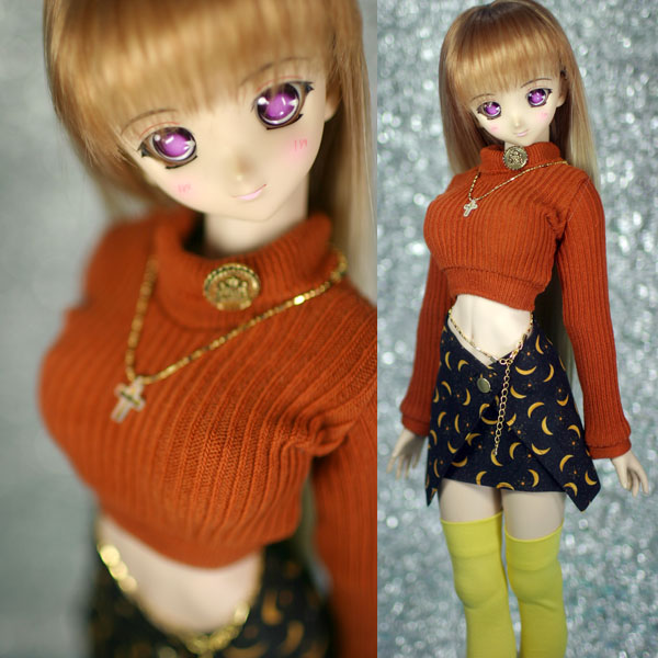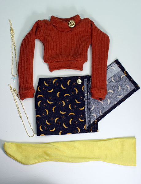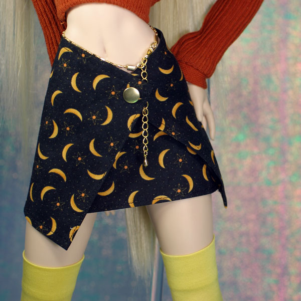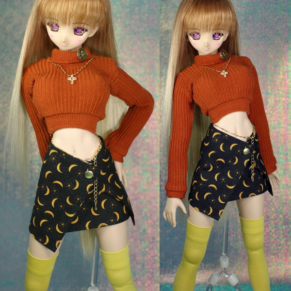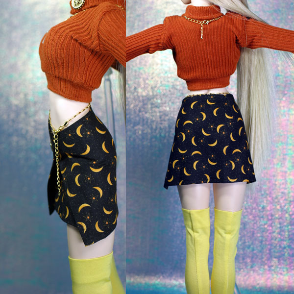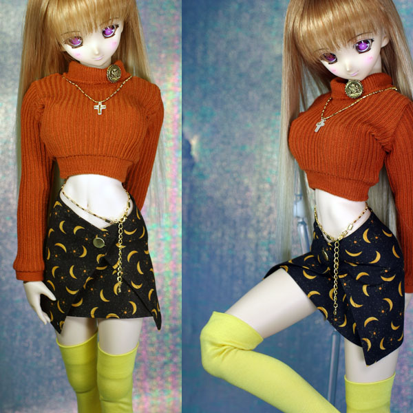 ラップミニスカートのセット。 イエローのニーソックス付き。 ニーソはシルケット加工の生地なので、光沢感があります。