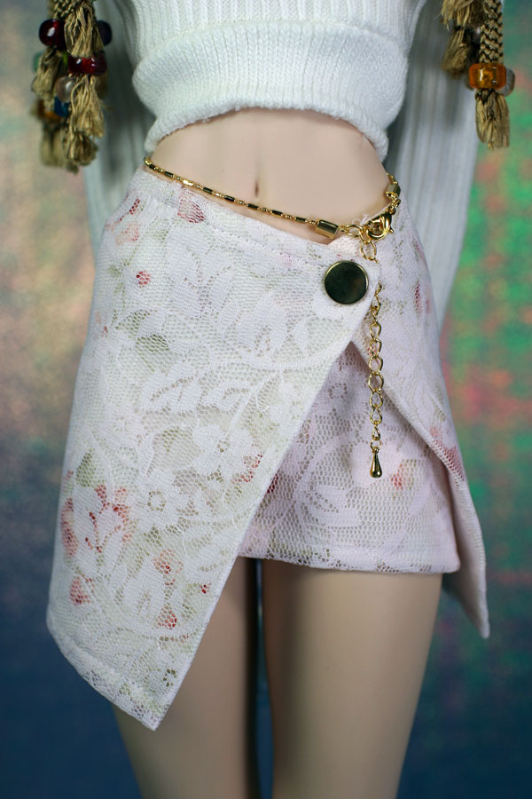 スカートは白い花柄の生地とピンクレースを重ねています。 アメリカンスナップで留めます。