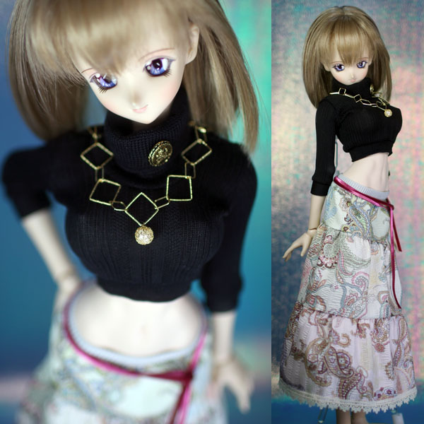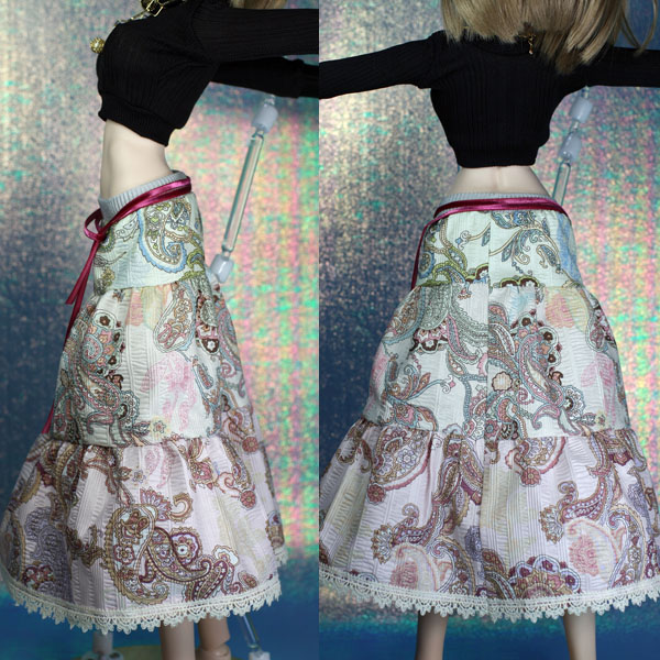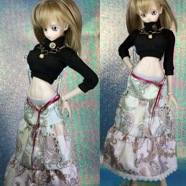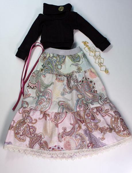 ショート丈七分袖のトップスと3段ギャザーのロングスカート。