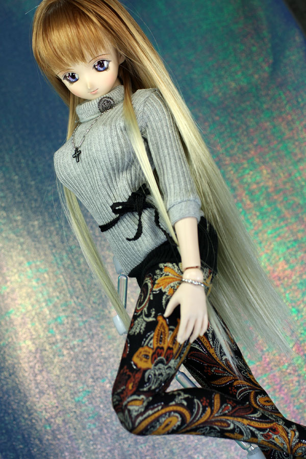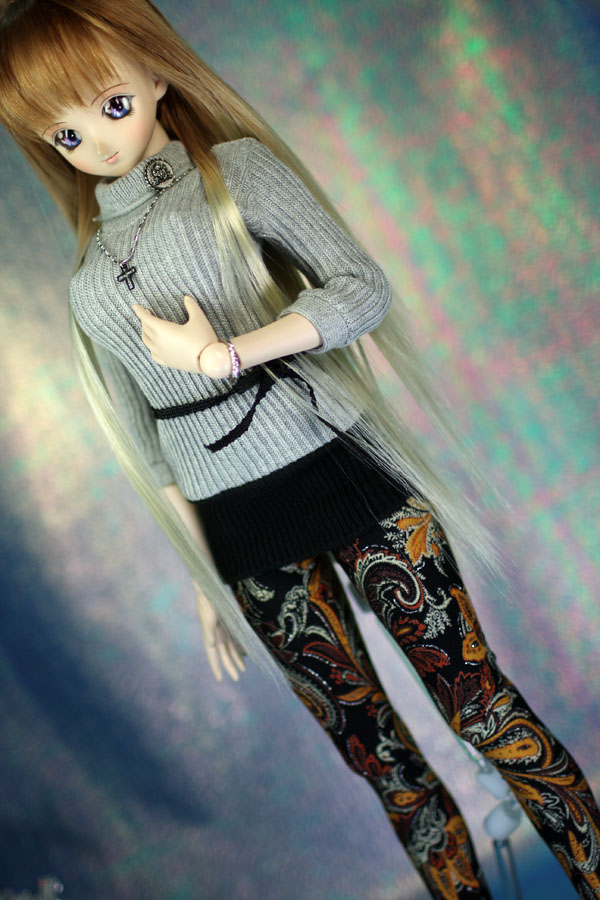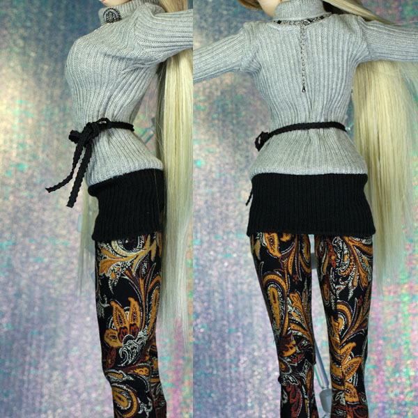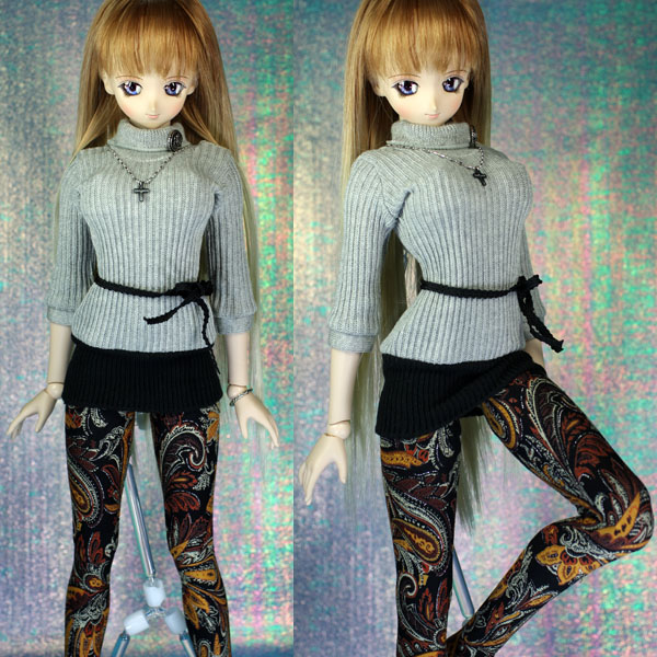 お嬢さんぽいグレー・黒のすそ切り替えワンピに 派手な柄タイツ風ソックス。