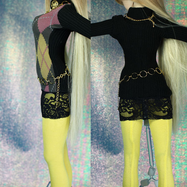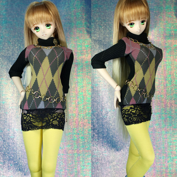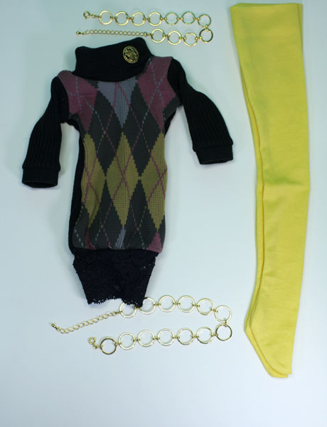 イエロー系のアーガイル柄の生地を使ったニットワンピース。