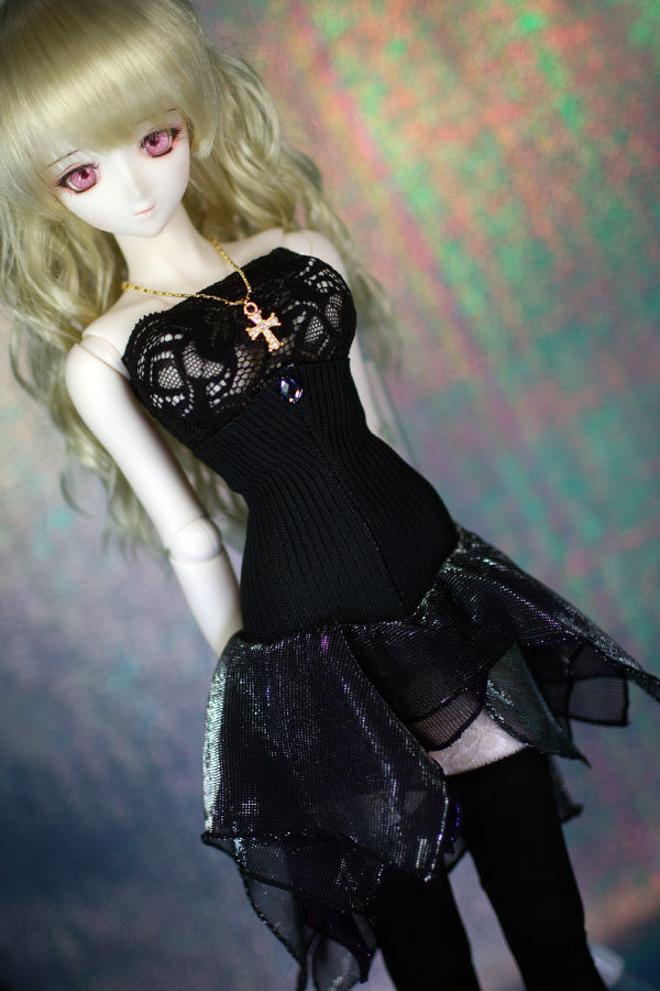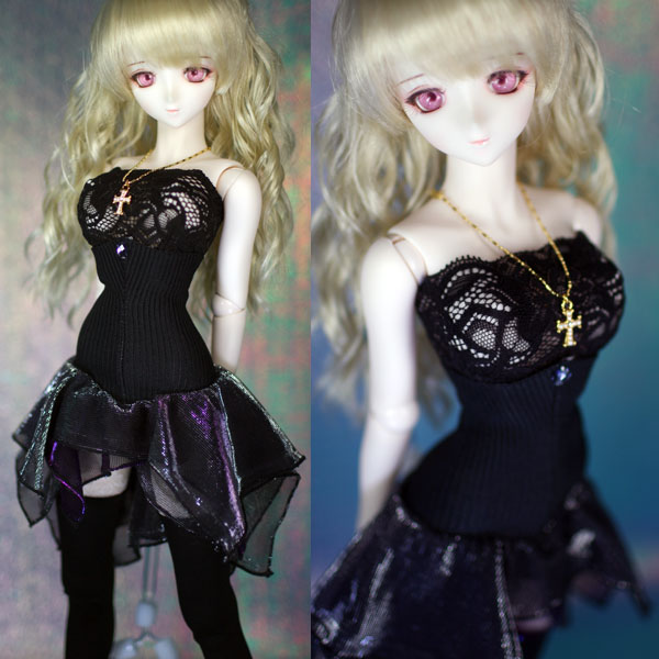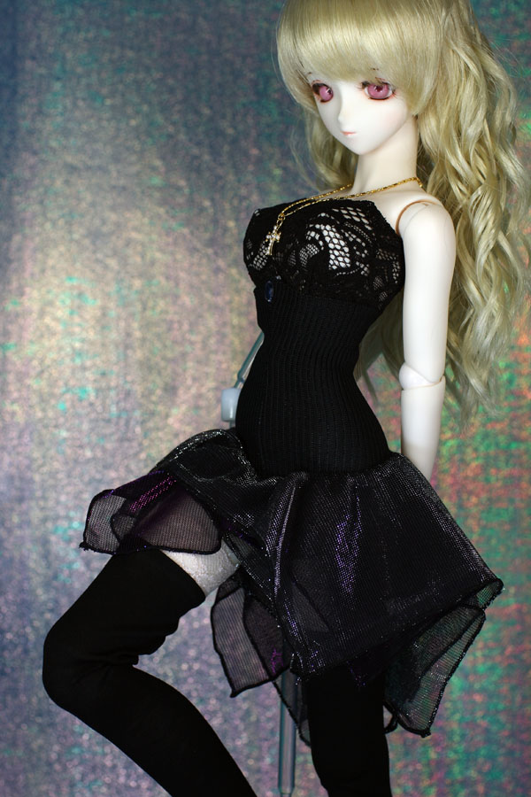 裾を巻きロックで処理した黒・紫・黒のラメの入った生地を重ねてスカートにしています。