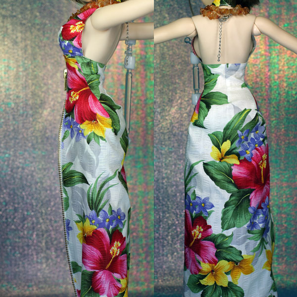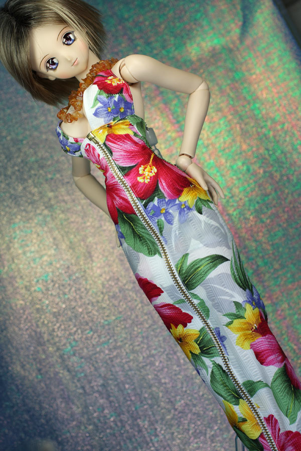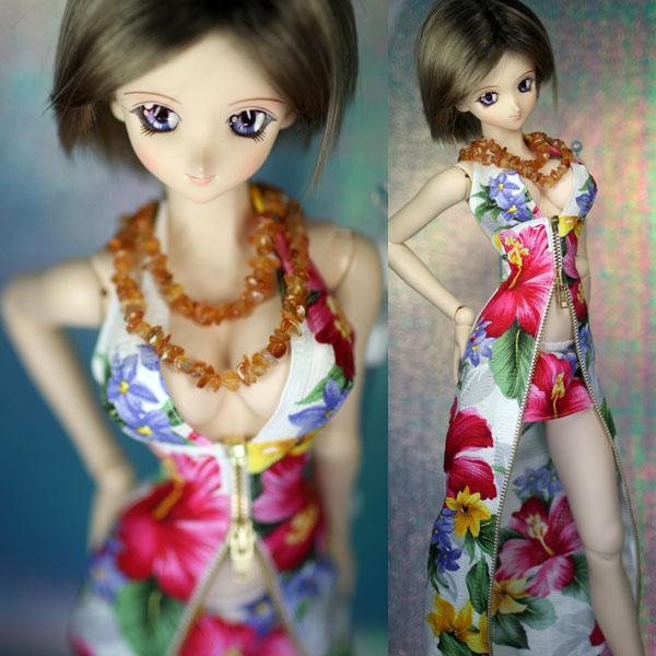 前面がオープンファスナーになっているワンピースです。 大きなハイビスカス柄。 ネックレスはカーネリアン。2重に巻く長めのものです。 ファスナーを開けた時用にインナースカートを作りました。